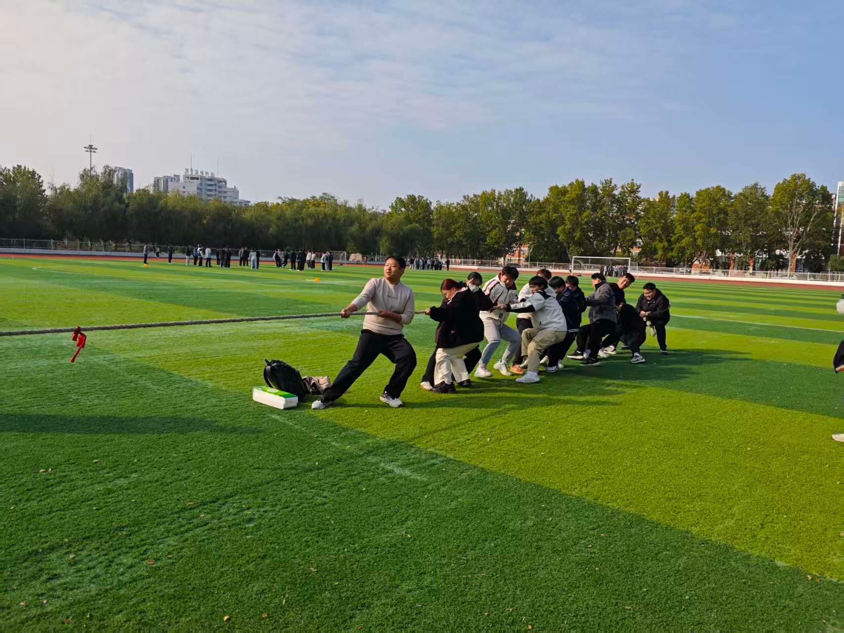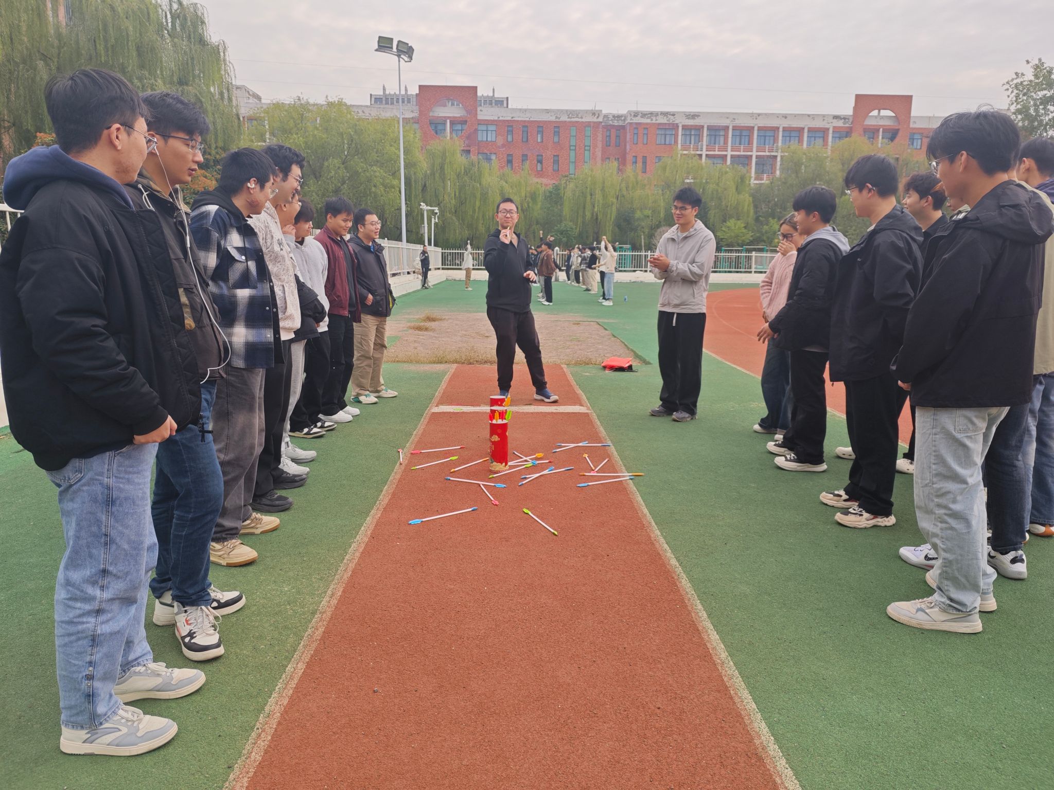 本次趣味运动会设置了多项集趣味与团结协作于一体的比赛。“两人三足”考验着队员间的默契配合;“旋风跑”需要全队统一步调,手持长杆绕桩冲刺;紧张刺激的“趣味拔河”将现场气氛推向高潮。此外,“投壶”与“沙包”等积分赛也吸引了众多同学一试身手。每一个项目的精彩呈现不仅是体能的较量,更需要集体智慧与团结协作。赛场上下欢声笑语不断,同学们在运动中尽情释放活力,展现了课堂之外的卓越风采。
