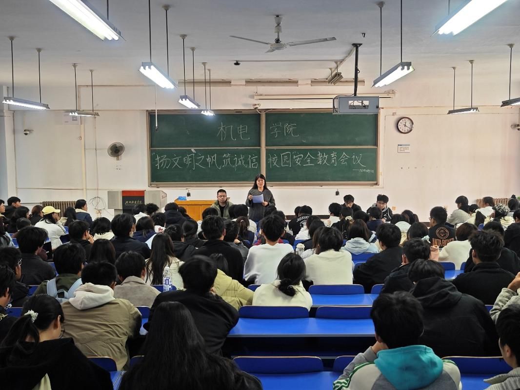 为进一步增强学生安全意识,规范日常行为管理,营造平安、和谐、稳定的校园环境,11月13日中午,机电学院在四号教学楼合二教室组织召开以“扬文明之帆 筑诚信校园”为主题的安全教育会议。学院团委书记刘颖、2025级辅导员孙迎春以及各班班委共计200余人参加会议。