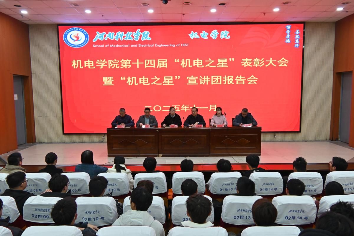 11月27日下午,机电学院第十四届“机电之星”表彰大会暨“机电之星”宣讲团报告会在图书馆一楼报告厅隆重举行。我院党政领导班子成员,全体辅导员,第十四届“机电之星”及学生代表300余人参加,会议由党委副书记何涛主持。
