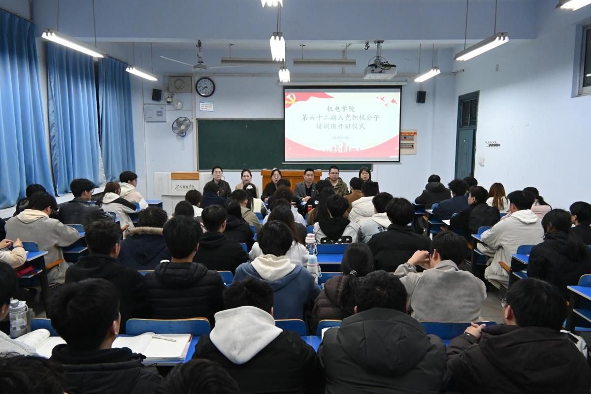 为加强入党积极分子培养教育,严把党员发展入口关,3月20日晚,机电学院在6201教室举行第62期入党积极分子培训班开班仪式。学院党委书记张雅凌、党委副书记何涛,全体辅导员及72名入党积极分子培训学员参加仪式,仪式由正科级辅导员侯怡主持。