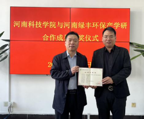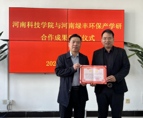 3月29日上午,河南科技学院与河南绿丰环保工程有限公司联合举行产学研合作成果颁奖仪式。双方共同申报的两项科研成果均获省级重要奖项,其中《屠宰企业污水处理关键装备及技术创新》项目荣获河南省装备制造工业科学技术特等奖,《肉制品行业高氨氮、高有机磷污水高效治理关键技术创新及应用》项目荣获河南省环保联合会科学进步二等奖。颁奖仪式在机电学院404会议室举行。我校副校长丁轲、河南绿丰环保工程有限公司董事长薛水波、机电学院院长聂福全教授及相关专业教师参加仪式。