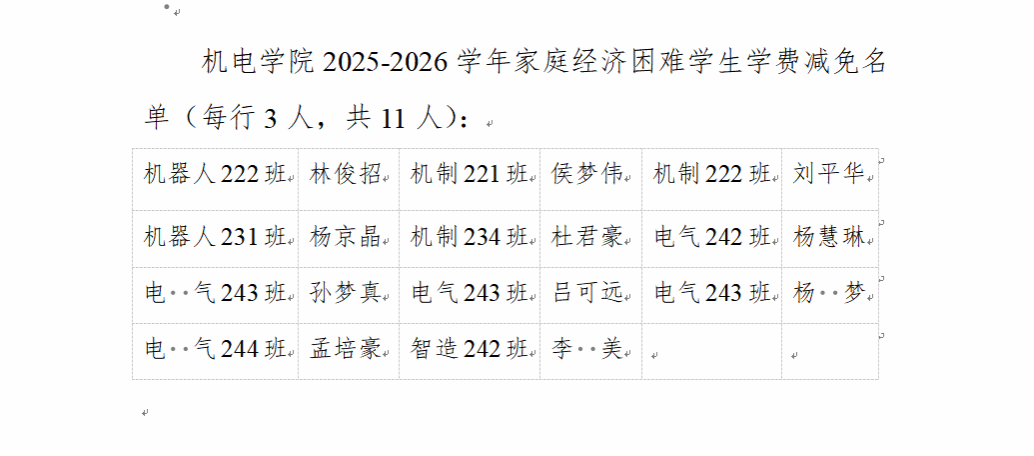 根据《河南科技学院家庭经济困难学生学费减免实施办法》(校发字[2017]193号)文件精神,结合我院实际情况,经学生申请,学院审核,现将机电学院2025-2026学年家庭经济困难学生学费减免拟定名单予以公示,公示期为五个工作日(3月17日-3月23日),公示期间如有异议,请及时向机电学院团委反映,不接受匿名反映,联系电话:0373-3693182。